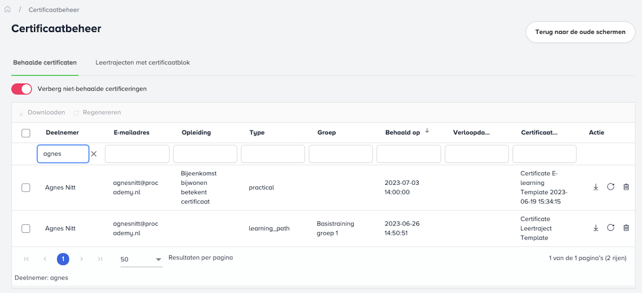 Op het tabblad 'Behaalde certificaten' zie je alle certificaten. Met de zoekfilters kan je makkelijk zoeken op een naam of deel van een naam. Klik je op een kolomkop, dan sorteer je de gegevens.