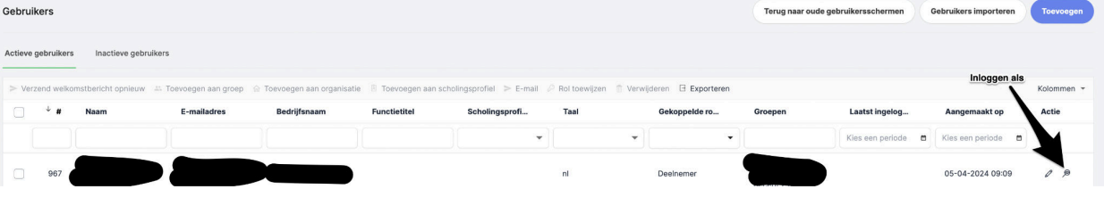 Er zijn verschillende plaatsen waar je kunt inloggen als deelnemer. Kijk bijvoorbeeld bij Menu > Gebruikers. Filter op de gebruiker waarmee je wil inloggen en klik op de actie Inloggen als.