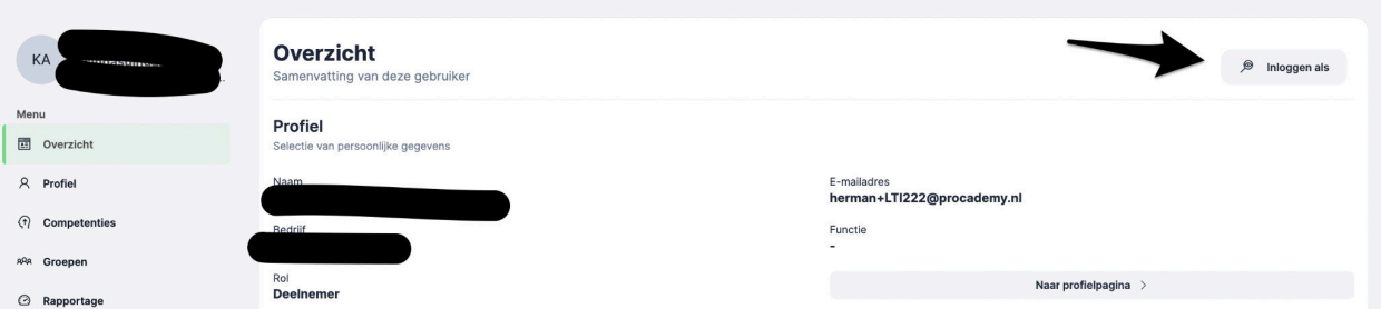 Als je deelnemer bewerkt met het potloodje ✏️, kan je ook ‘Inloggen als’ in het tabblad ‘Overzicht’.