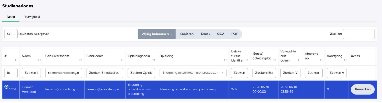 Filter op de betreffende deelnemer en opleiding (e-learning) waar het over gaat.