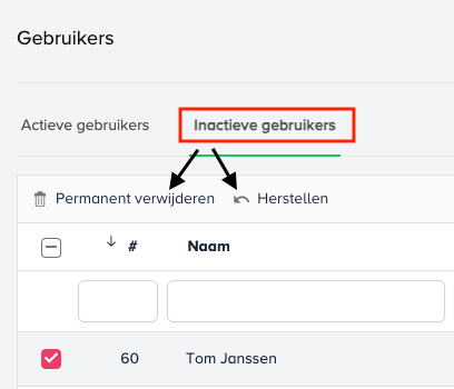 🗑️ Verwijderenom deze inactief te maken. De gebruiker wordt nu verplaatst naar het tabblad Inactieve gebruikers.Om de gebruiker permanent te verwijderen, ga je naar het tabblad Inactieve gebruikers, selecteer je de gebruiker, en klik je op
