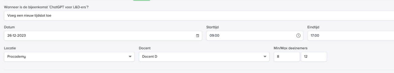 Vul de datum, starttijd, eindtijd, locatie, docent en min/max deelnemers in van