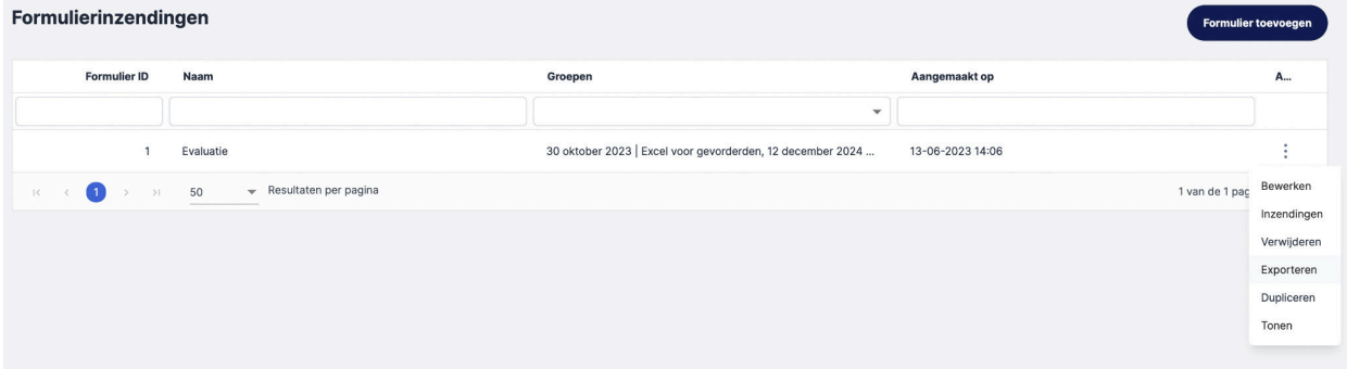 Klik op de drie puntjes achter het formulier en kies voor ‘Exporteren’ om de evaluatie inzendingen in