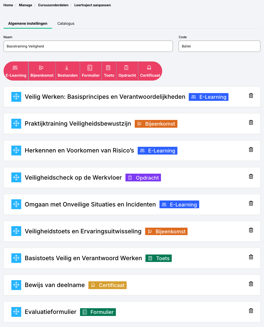 Trainingsstructuur: Denk na over hoe je trainingen wilt structureren. Zorg ervoor dat de inhoud van de training logisch en overzichtelijk is. Je bundelt een reeks leeractiviteiten zoals e-learnings, bijeenkomsten, opdrachten en toetsen. Zo’n pakketje lesmateriaal voor een enkele training, noemen we een leertraject.