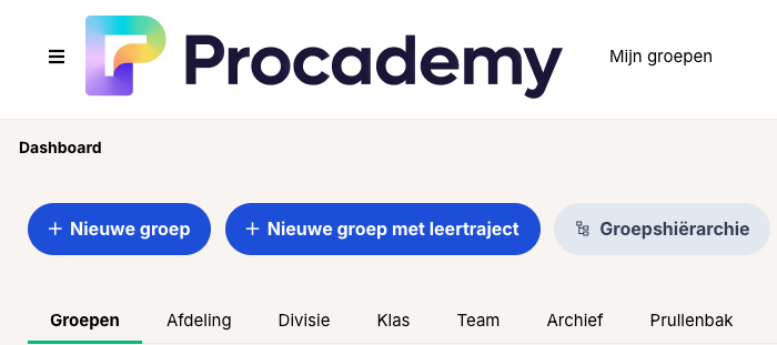 Groepen en teams: Je kan groepen of teams aanmaken binnen Procademy, zodat je specifieke gebruikers of groepen toegang kunt geven tot bepaalde cursussen of materialen.