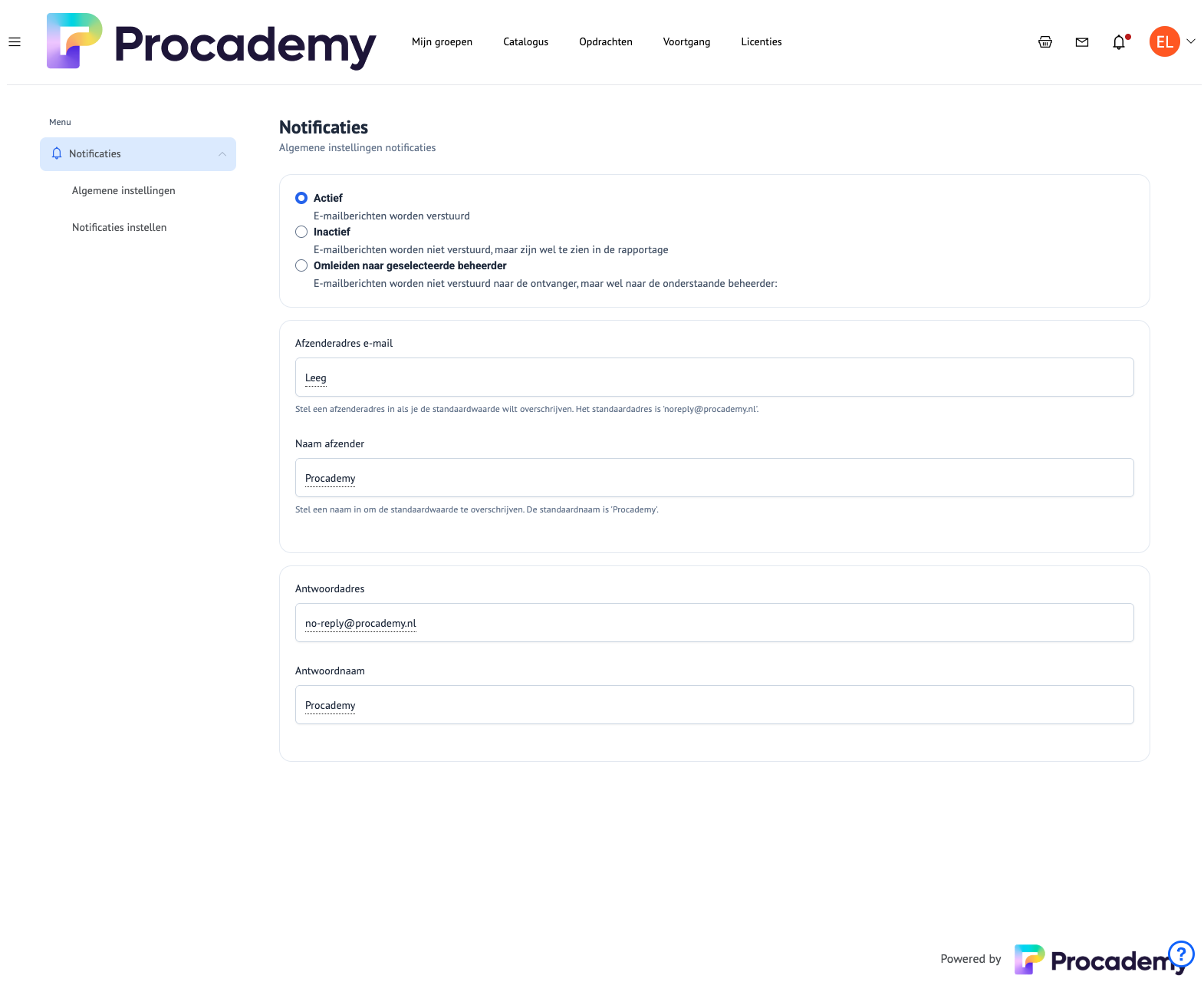 Hier geef je ook de afzender en het antwoordadres van alle geautomatiseerde notificaties aan. Standaard is dit Procademy met het adres noreply@procademy.nl.