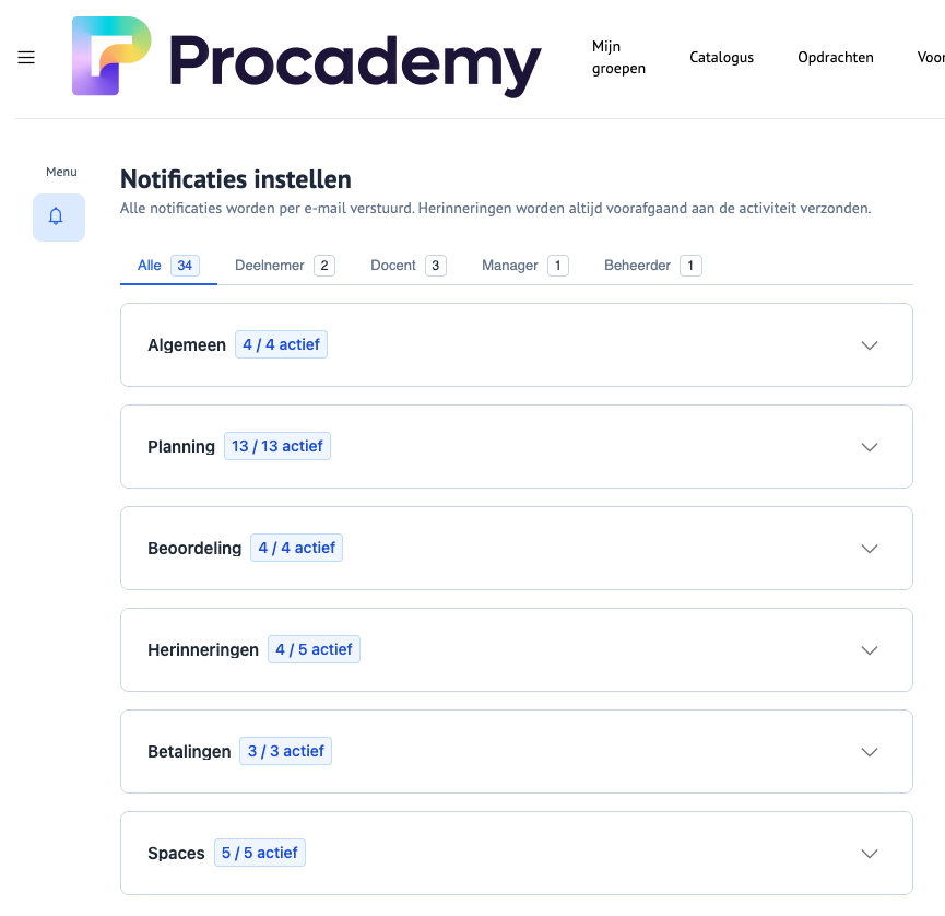 Het als beheerder mogelijk om zelf je notificaties te beheren. Dat betekent dat jij zelf mag instellen welke berichten je ontvangt. Je geeft aan welke notificaties nuttig zijn voor jullie omgeving.