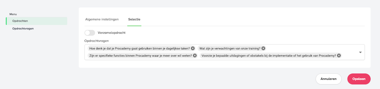Op het tabblad 'Selectie' selecteer je de vragen die bij de opdracht horen. Op deze manier zijn de vragen gekoppeld aan de opdracht.