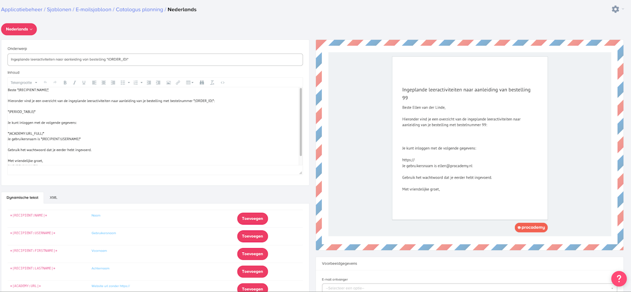Je ziet verschillende stukjes tekst die beginnen met *| en daar ook weer mee eindigen. Dat zijn stukjes dynamische tekst. Hier wordt de tekst aangepast naar de situatie. Bij het stukje dynamische tekst RECIPIENT : NAME zal bijvoorbeeld de naam van de ontvanger worden ingevuld door het systeem. Onderaan de pagina staat een lijstje met stukjes dynamische tekst die kunnen worden ingevuld door te klikken op Toevoegen.