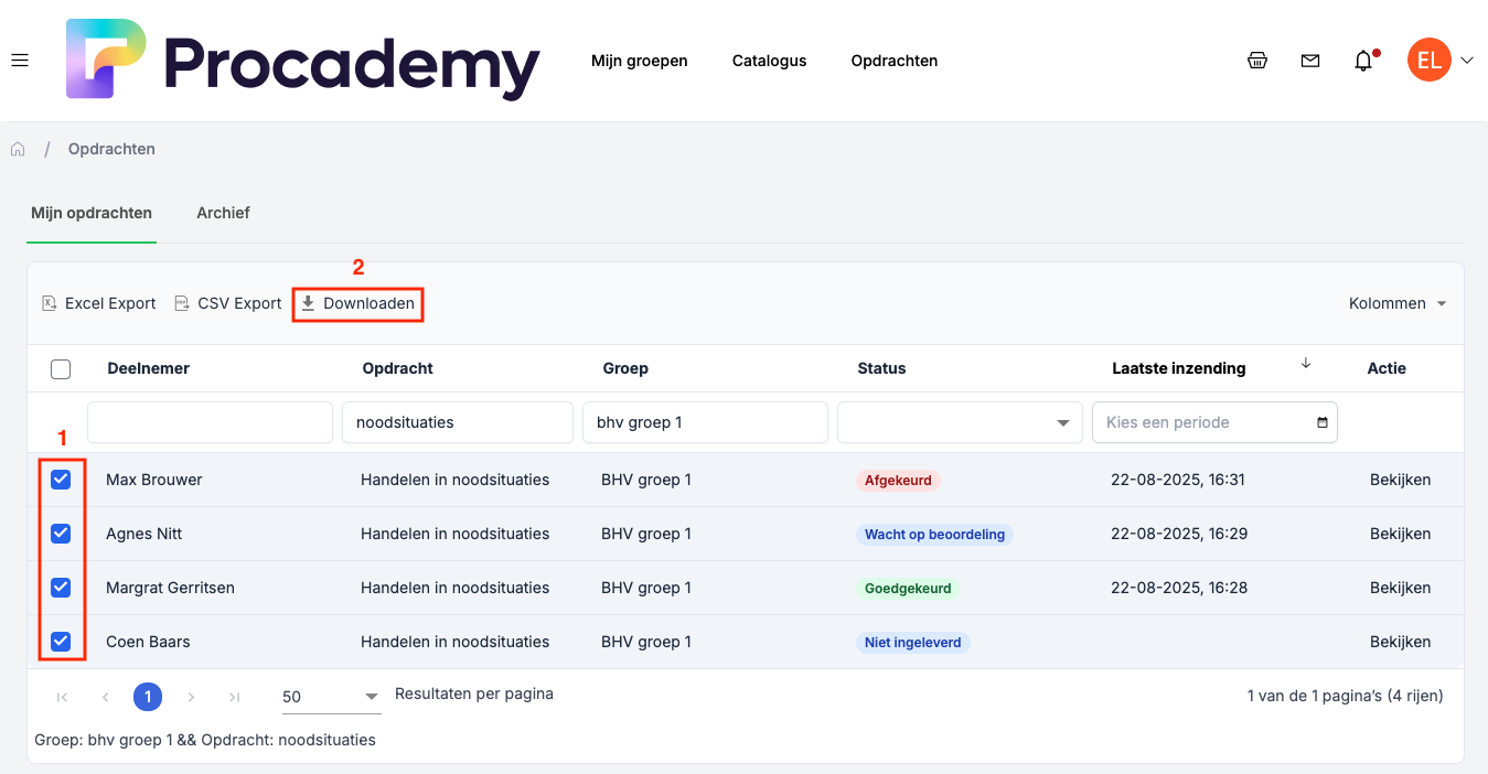 Selecteer de opdrachten waarvan je de bestanden wil downloaden.