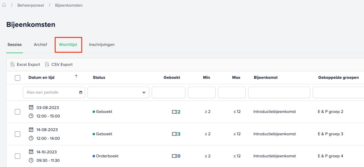 Vanuit de digitale klas kan je één of meerdere gebruikers verplaatsen. Je zoekt hier op de bijeenkomst waarin je veranderingen wil doorvoeren. Vanuit de digitale klas kan je ook iemand op een wachtlijst zetten als je nog geen geschikte datum weet.