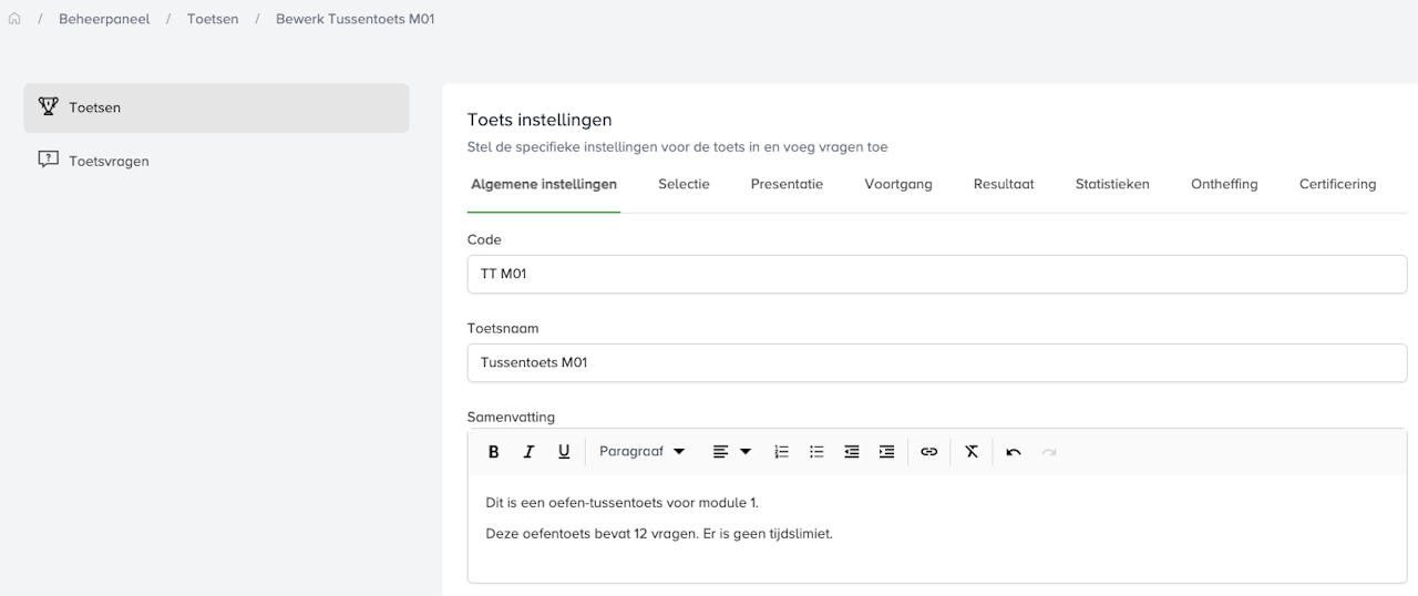 Toevoegenom een nieuwe toets te maken.Vul de toetsnaam in op het tabblad 'Algemene instellingen'.