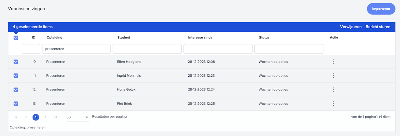 Alle voorinschrijvingen komen in een lijst terecht bij Menu > Voorinschrijvingen. Vanaf deze plaats kan je makkelijk zoeken en filteren, zodat je een selectie kan maken. Zo kan je selecteren welke deelnemers je een bericht wil sturen wanneer er een nieuwe mogelijkheid om de opleiding te volgen is.