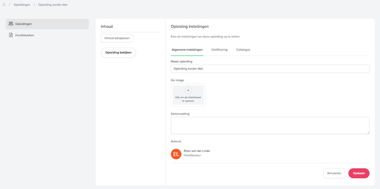 Je wil nu een widget pagina vullen met de fragmenten die je hebt klaargezet. Dat doe je door een opleiding aan te maken. Deze zul je als e-learning later terug vinden bij de cursusonderdelen.