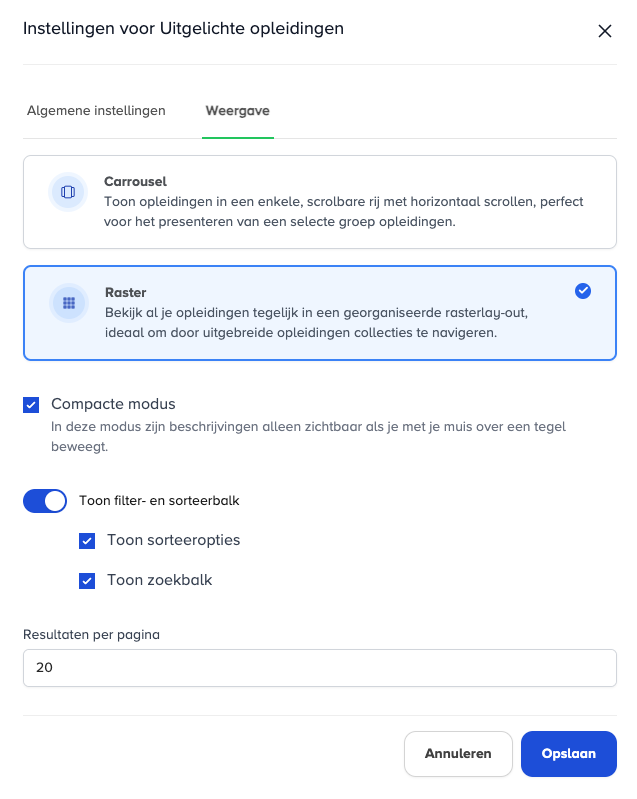 Geef aan hoeveel resultaten per pagina zichtbaar moeten worden.